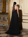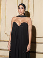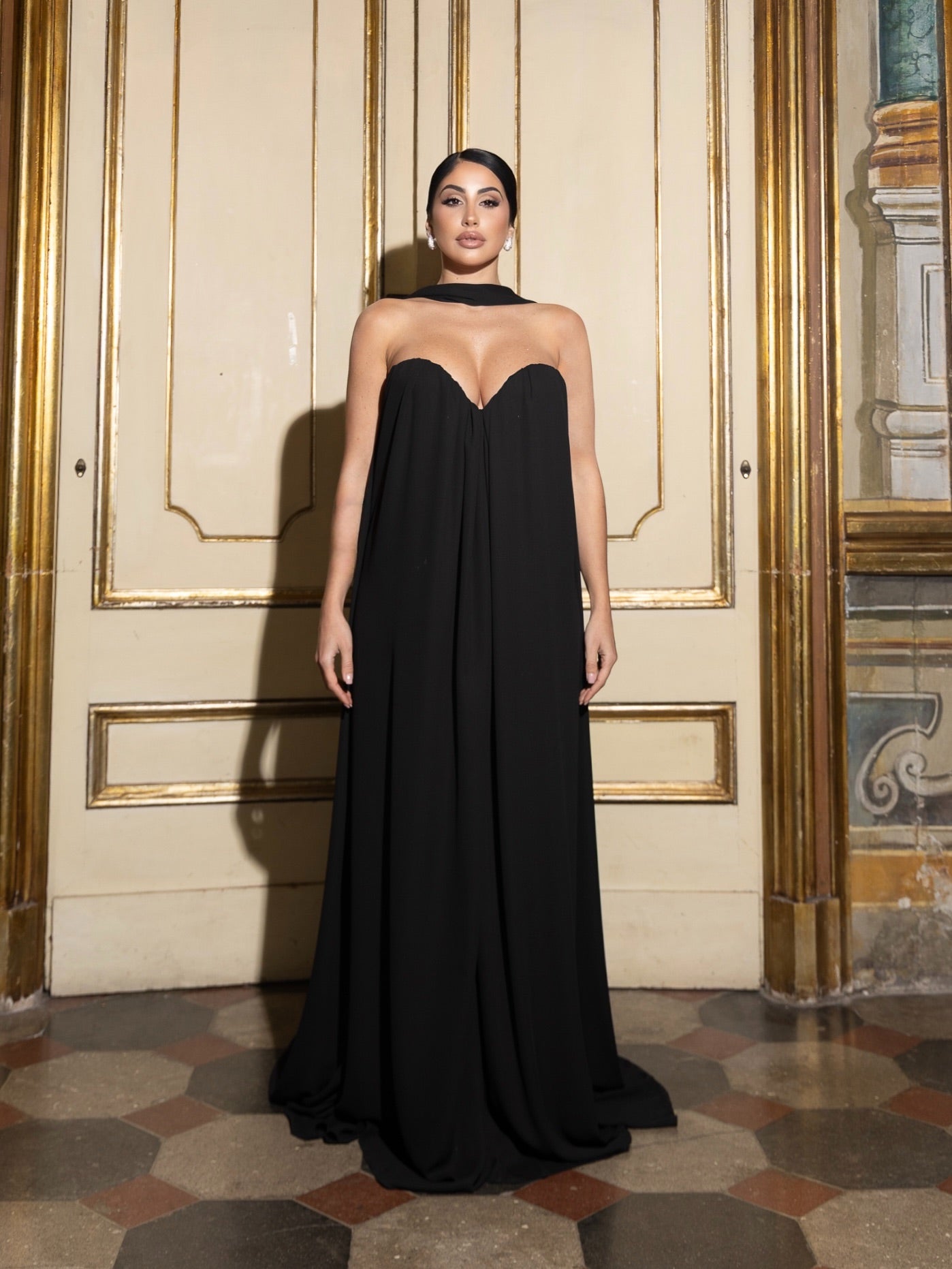 Abito in chiffon leggero e fluido con coppe interne e scollo a cuore, linea ampia e movimento etereo, chiusila invisibile sul retro.