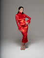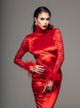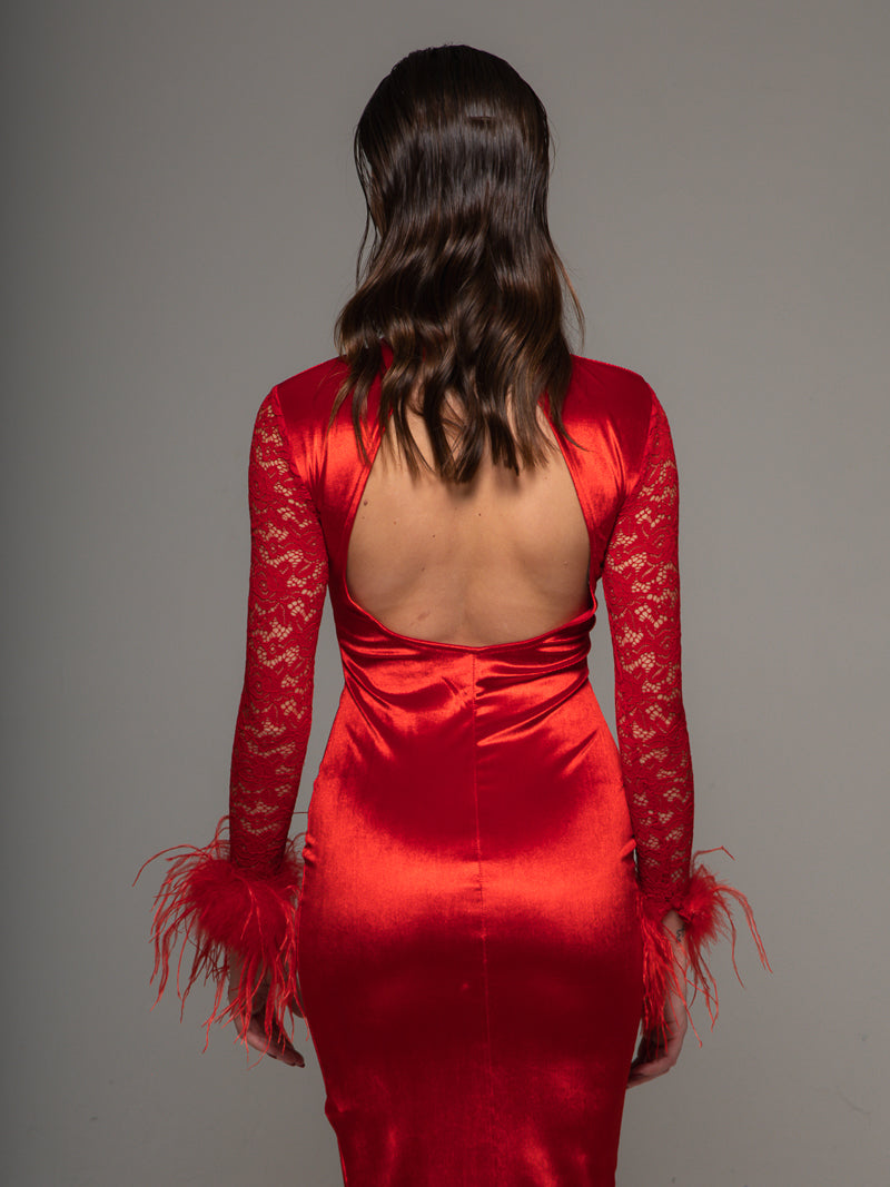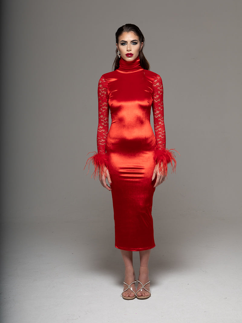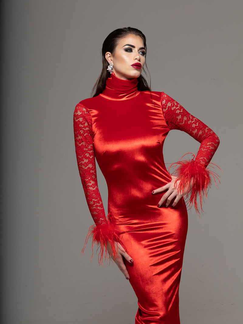 Tubino velluto elasticizzato con maniche in pizzo. Scollatura sulla schiena. Spacco sul retro. Piume rosse rimovibili.