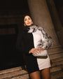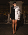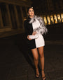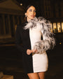 Abito elasticizzato con collo alto e piume bianche e nere rimovibili sulla manica sinistra.