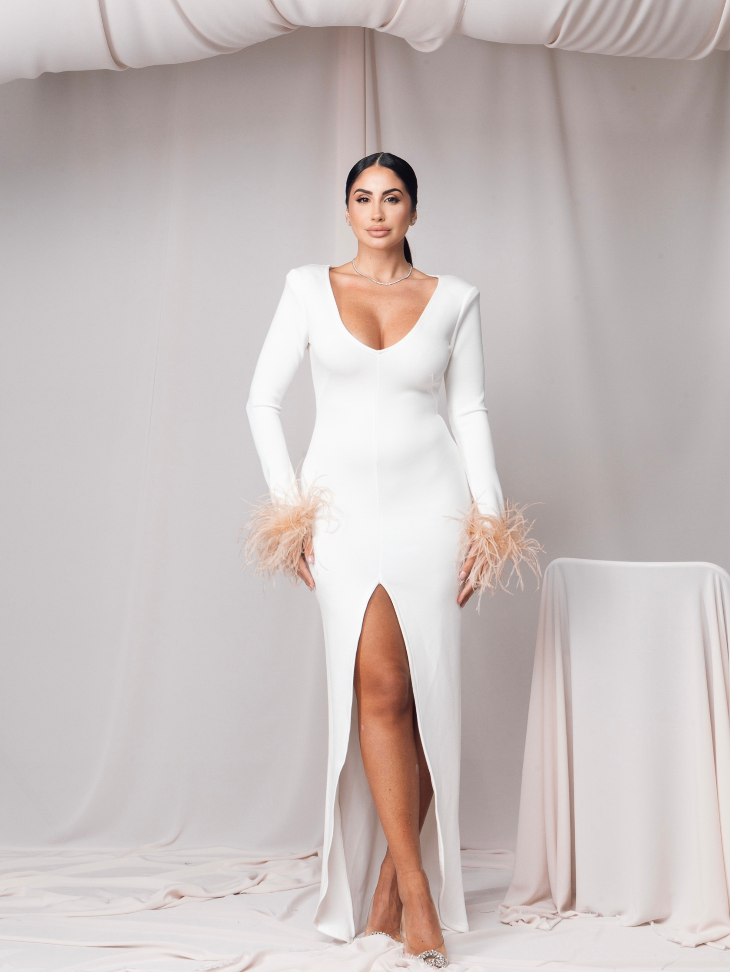 Abito elastizzato. Con spacco sul davanti e scollo a V. Piume rimovibili