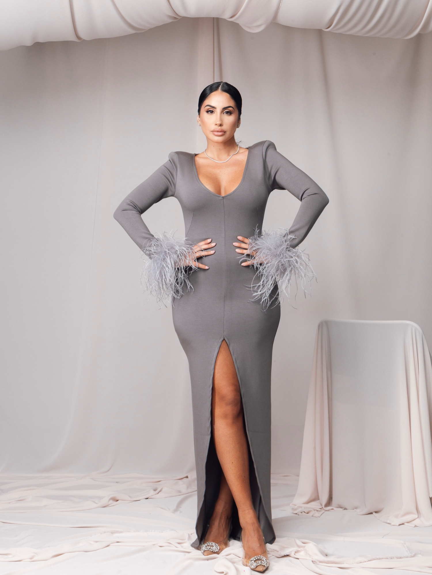 Abito elastizzato. Con spacco sul davanti e scollo a V. Piume rimovibili