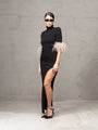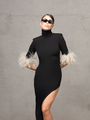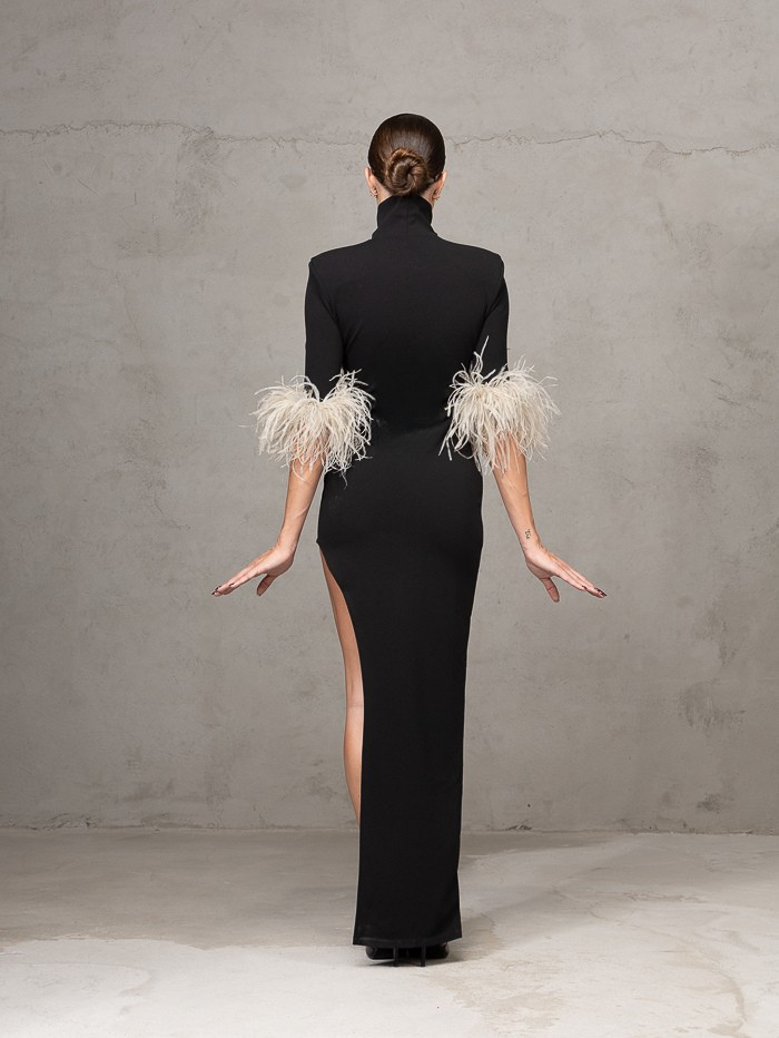 Abito elasticizzato , collo alto e spacco laterale con triplo strato di piume rimovibili