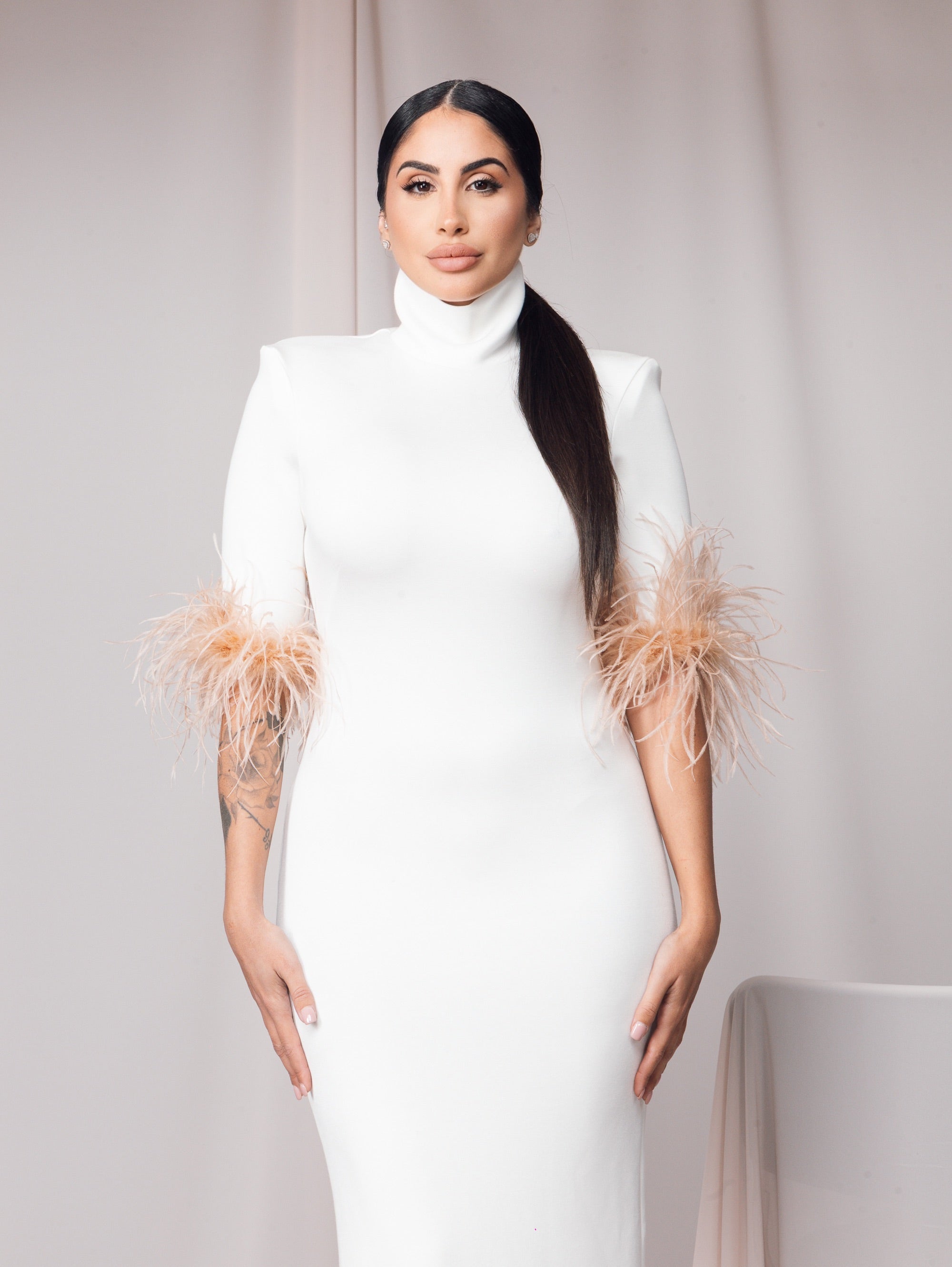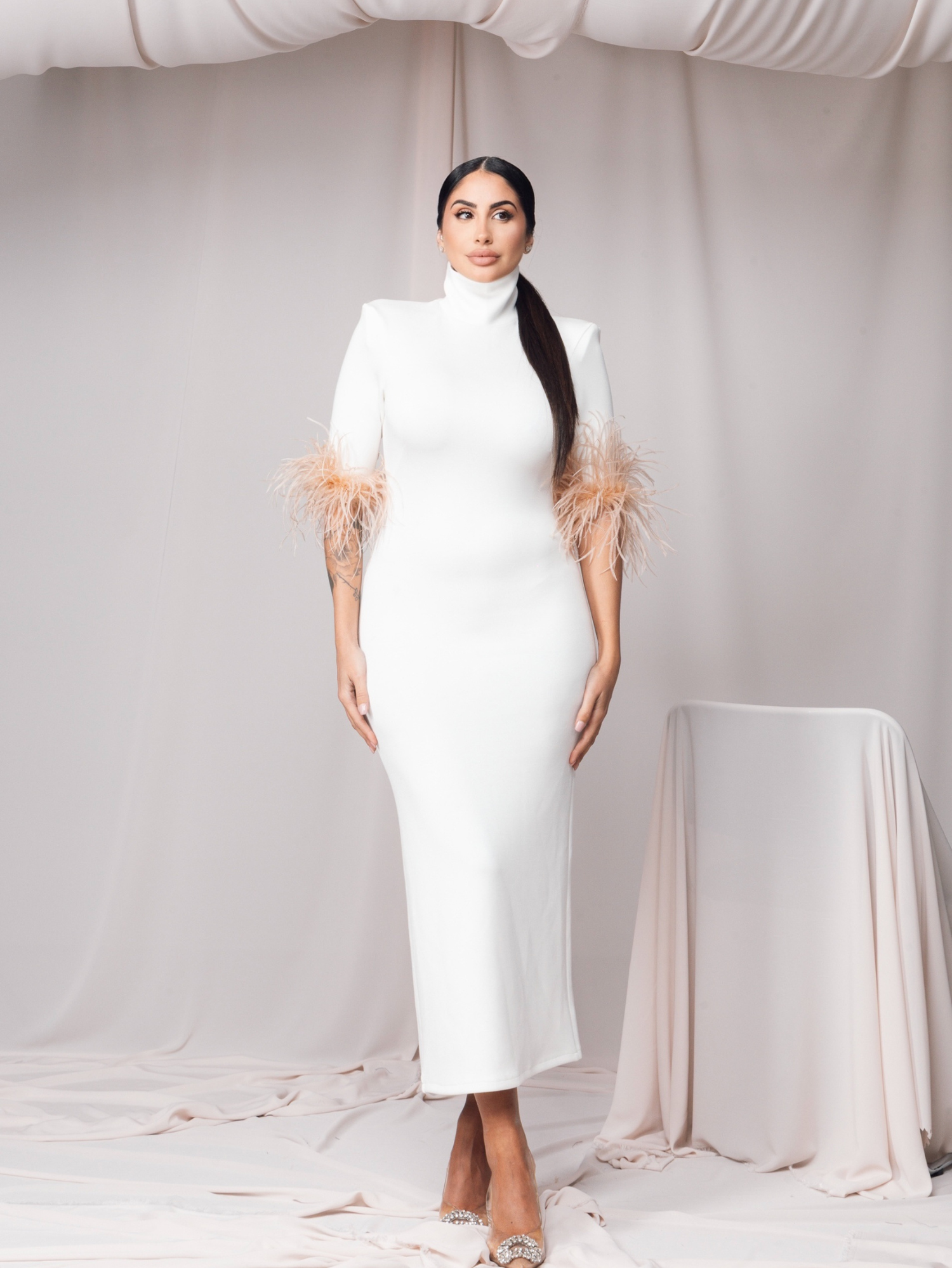 Abito elasticizzato. Collo alto. Spacco sul retro. Piume rimovibili