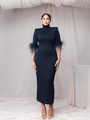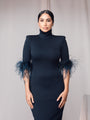 Abito elasticizzato. Collo alto. Spacco sul retro. Piume rimovibili