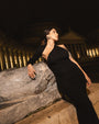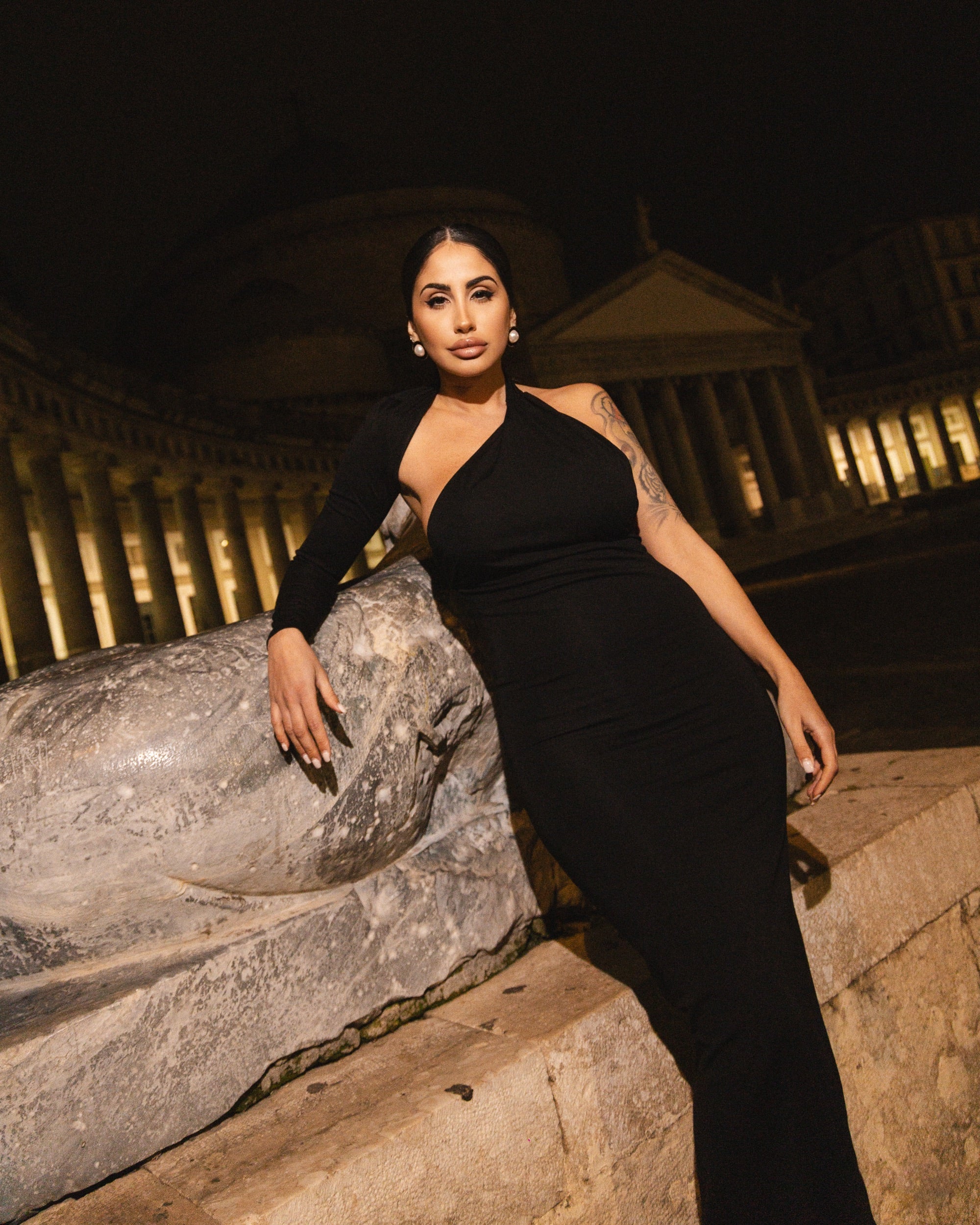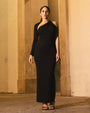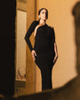 Vestito lungo elasticizzato con scollo asimmetrico e manica lunga