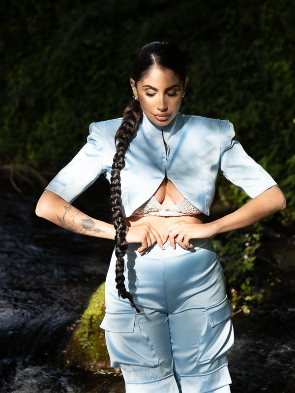Bolero in raso mezza manica con spalline imbottite. Collo alto. Chiusura con ganci frontali