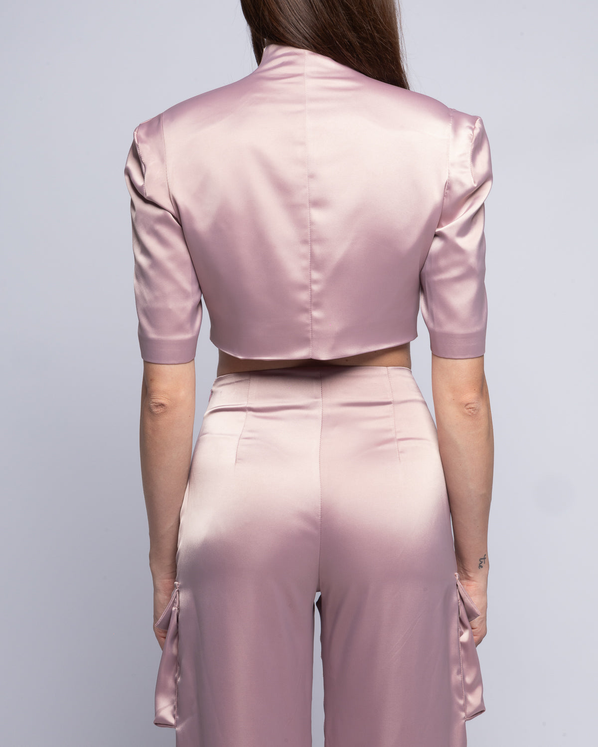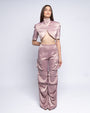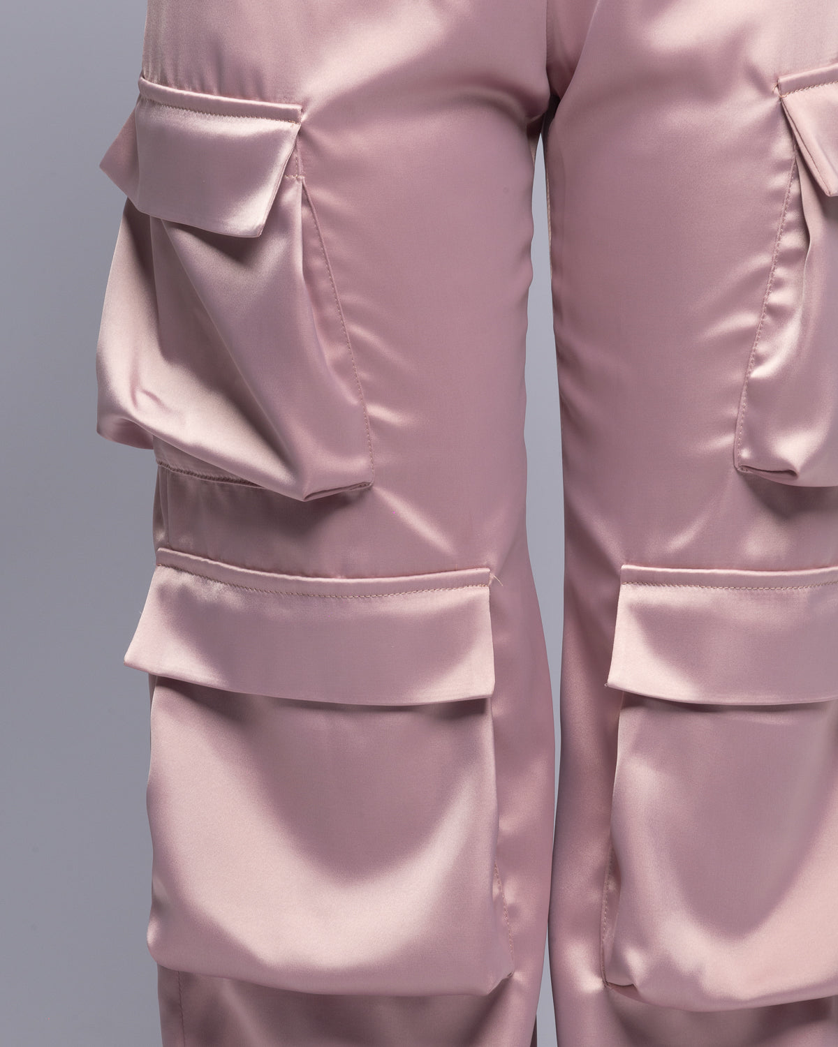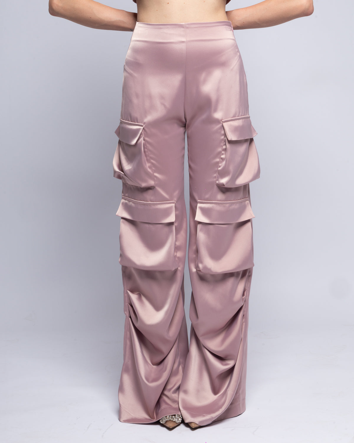 Cargo in raso gamba ampia, vita alta, chiusura con cerniera nascosta laterale. Tasche cargo, tasche laterali.