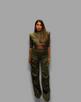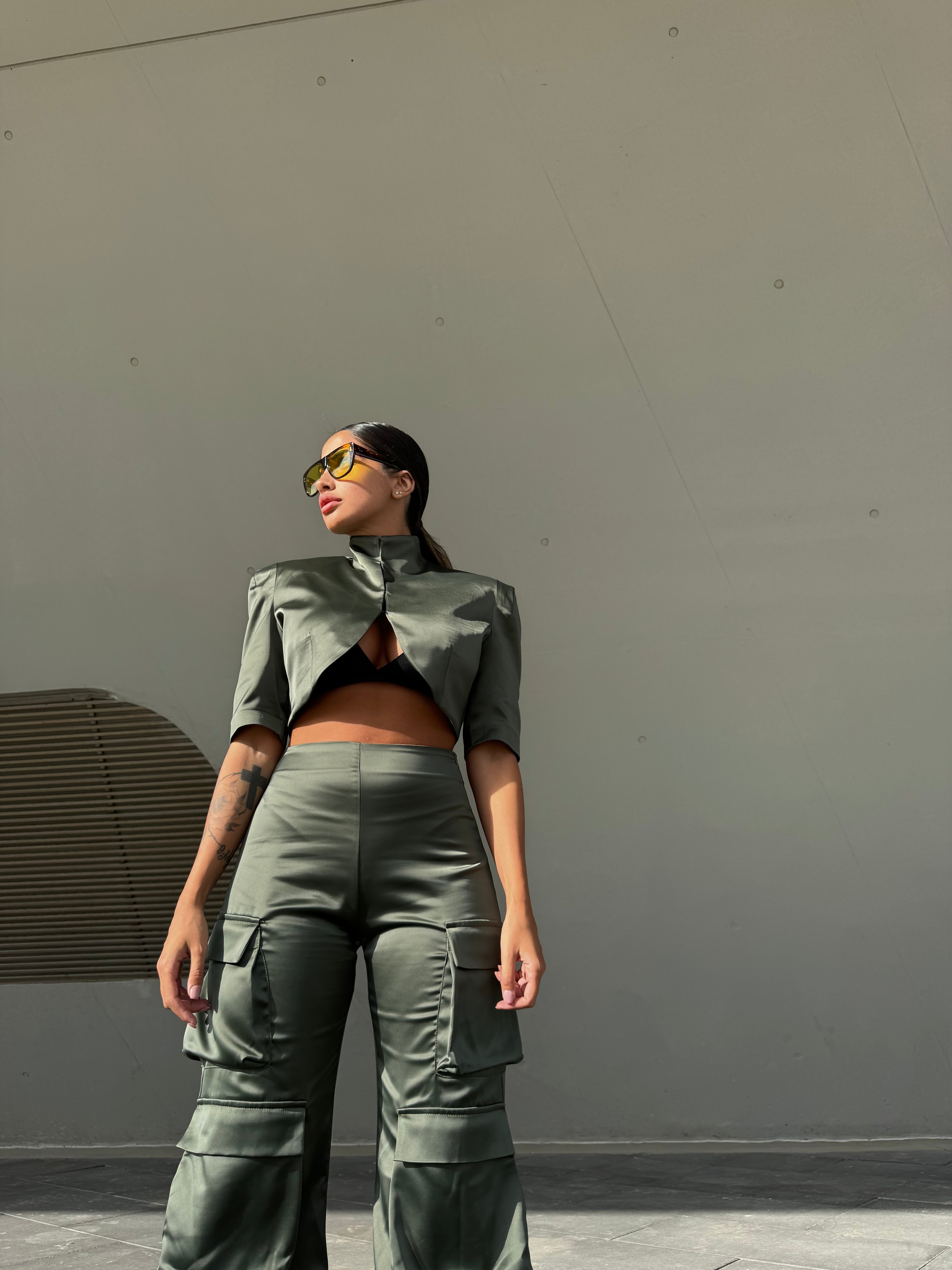 Cargo in raso gamba ampia, vita alta, chiusura con cerniera nascosta laterale. Tasche cargo, tasche laterali.