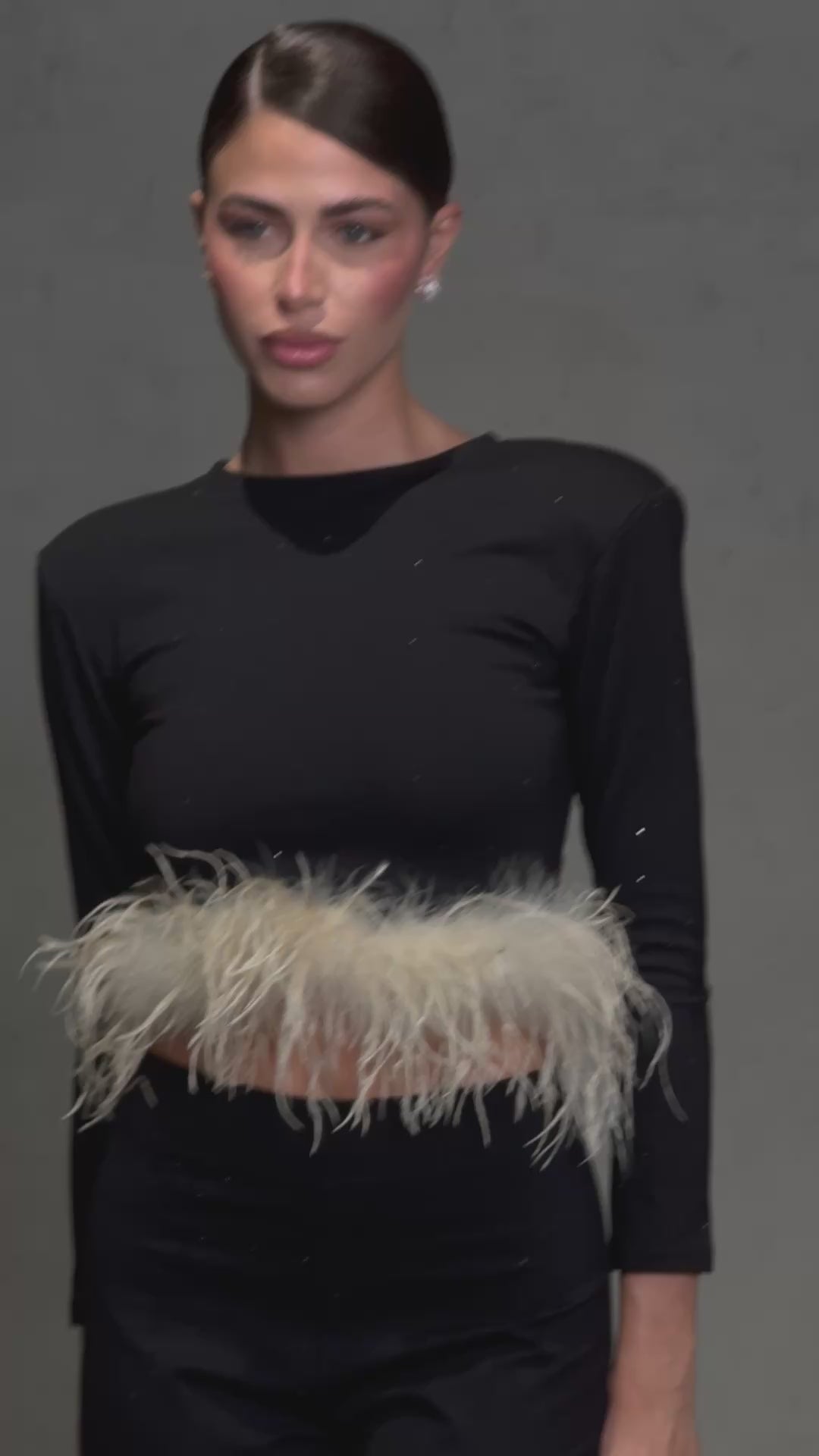 Maglia realizzata con tessuto elasticizzato con strass,spalline imbottite, zip sganciabile posteriore, piume beige rimovibili