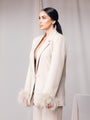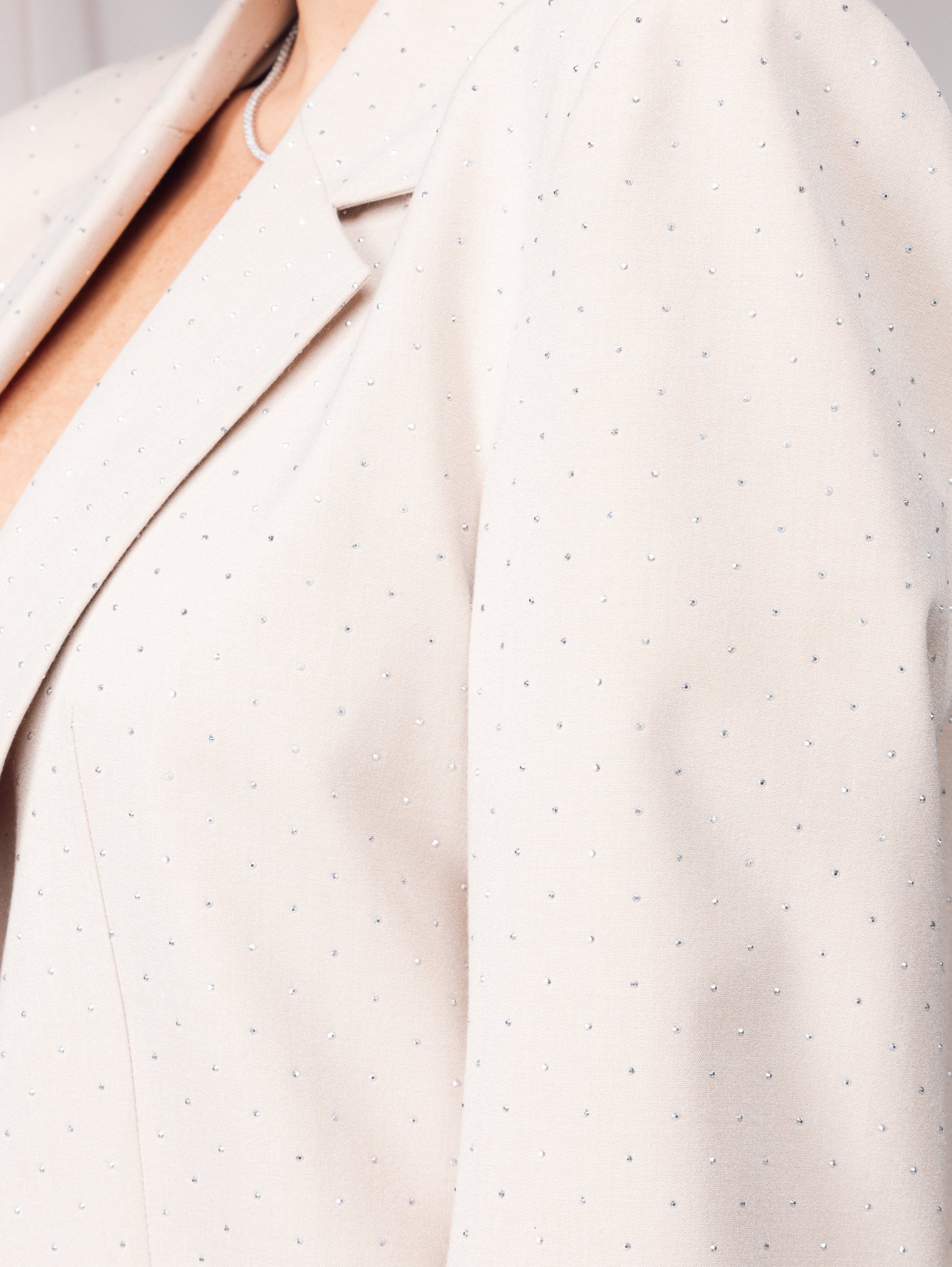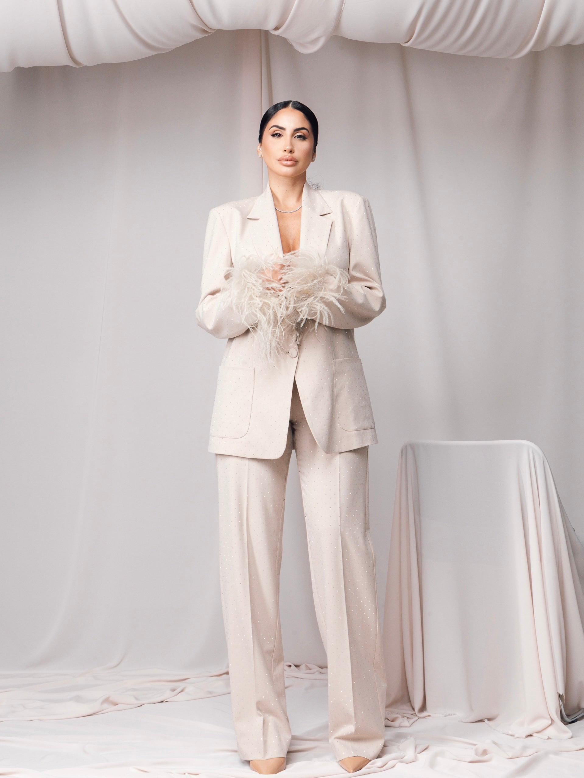 - Blazer oversize con strass con collo a revers, maniche lunghe e spalline. Tasche anteriori. Chiusura frontale con bottone. Piume beige rimovibili.