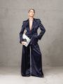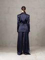 Giacca avvitata in satin, doppiopetto. Pantalone vestibilità ampia vita alta con bottone e zip sul davanti ed elastico sul retro. 95%PL 5%EA