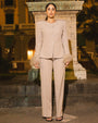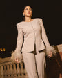 Giacca avvitata con chiusura frontale. Bottoni con strass. Spalline imbottite. Piume rimovibili beige