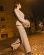 Pantalone vita alta. Gamba larga. Chiusura frontale con cerniera e bottoni